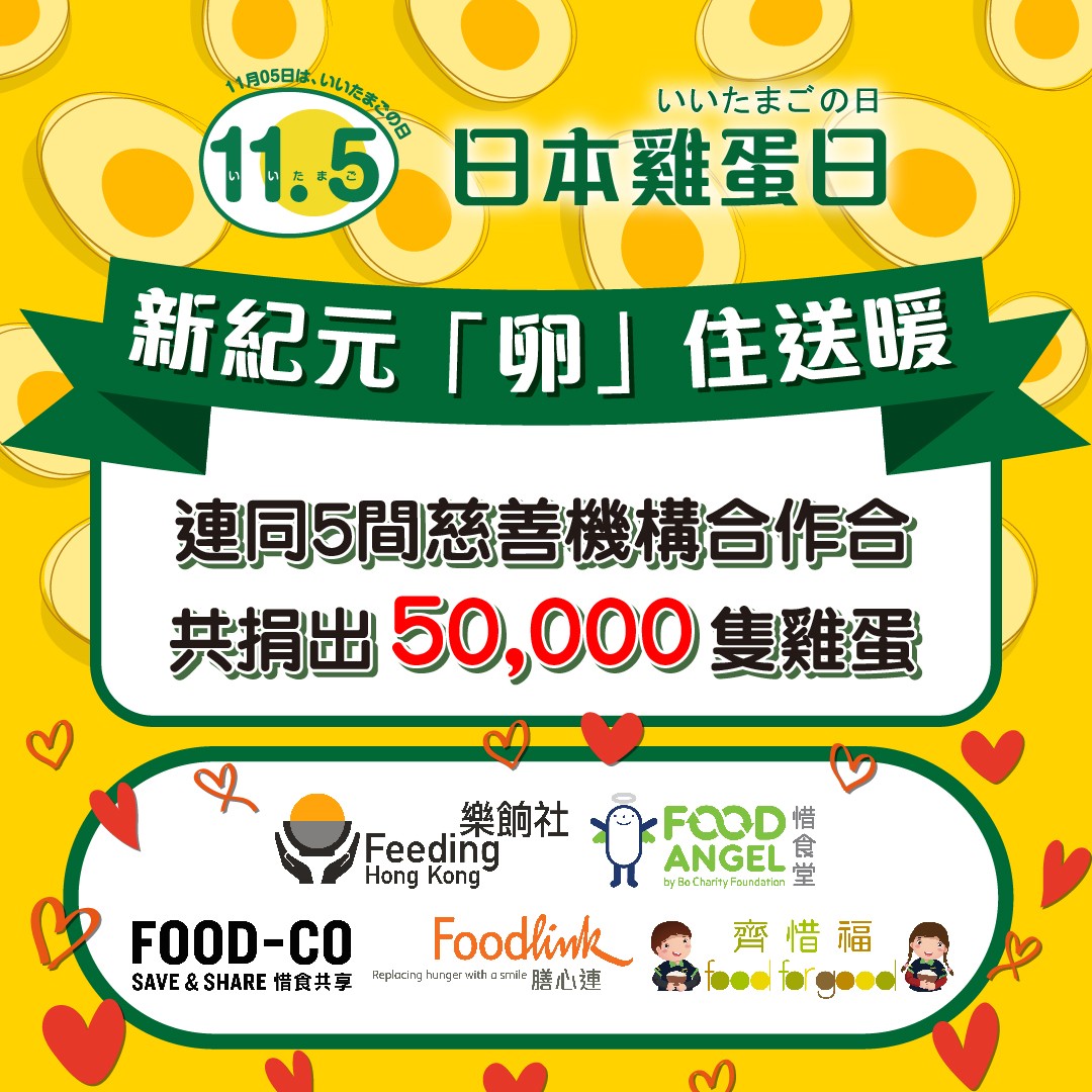 「新紀元卵」一直致力回饋社會,積極履行企業社會責任。今次更是首次與5間本地慈善機構合作,包括惜食堂、FOOD-CO、齊惜福、膳心連基金及樂餉社,合共捐出50,000隻雞蛋。所捐贈的雞蛋將會用來製成飯盒或派發予有需要人士,讓市民共享日本雞蛋的美味之處。再次感謝各位機構及義工的相助,以順利舉行派發相關的活動。